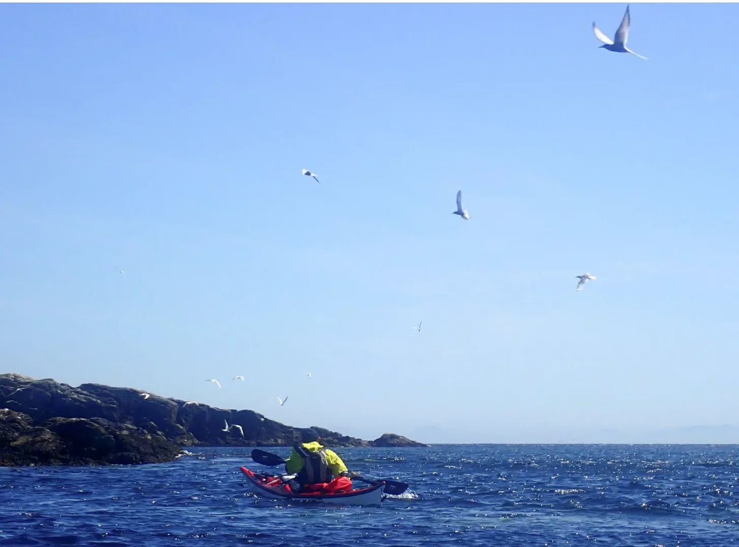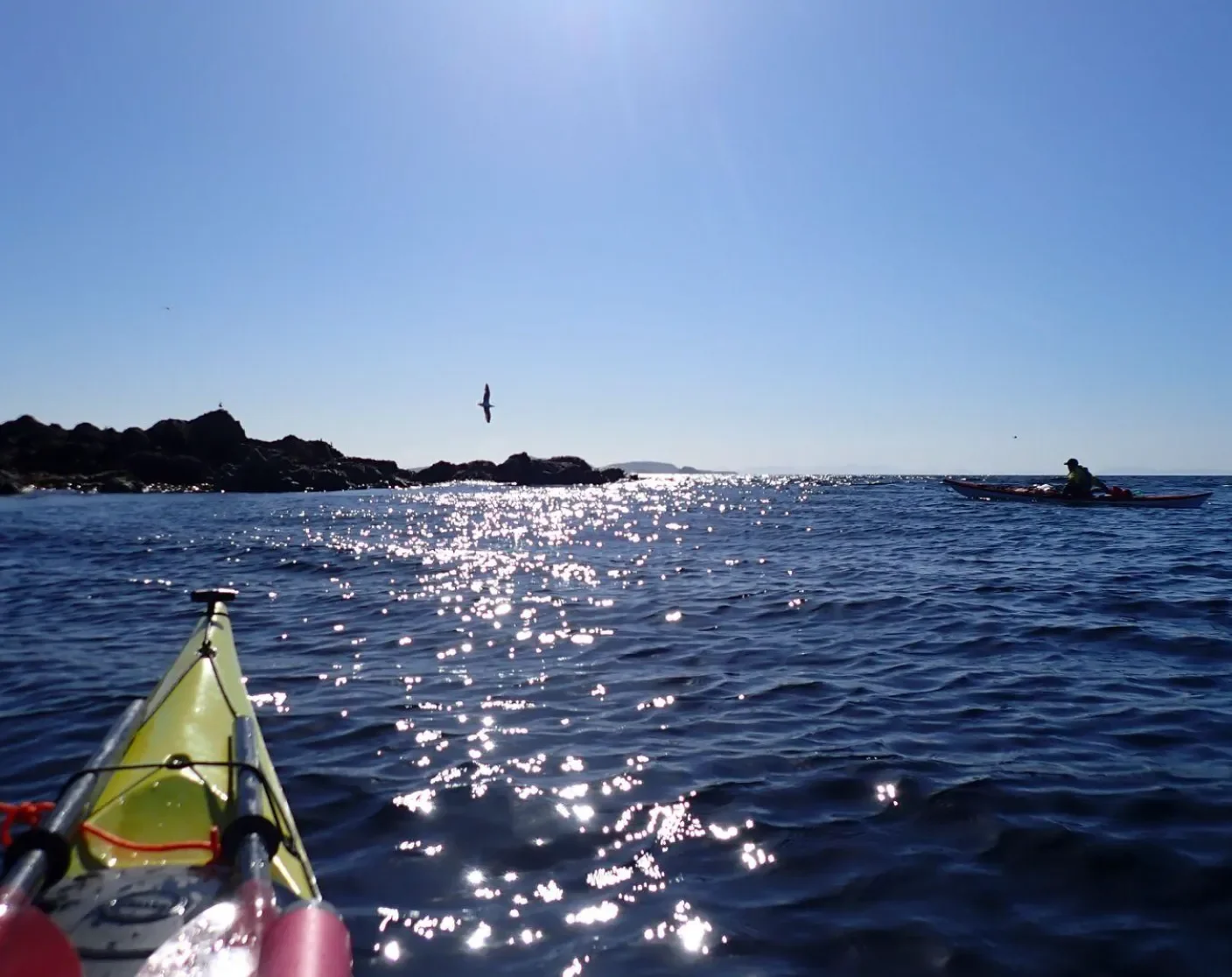 There was an incident when Paul dropped his paddle. I lent him my spare and then he set off frantically looking for it. I started looking too, but the small waves were high enough to hide a floating paddle. I thought it might help if I got up a bit higher, so I pulled my boat up onto a promontory and started peering out through my binoculars. Paul saw me and thought I was birdwatching and was cursing me. But then I spotted the lost paddle and was able to point him towards it - he realised then that I wasn’t ignoring the emergency for recreational purposes.