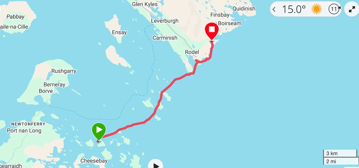 There is a ferry from Berneray, which is linked by a causeway to North Uist, to Leverburgh on Harris, and we did discuss paddling over to the ferry port and putting our kayaks on it. But we got the forecast, and we knew it was going to be better the following day. So, we made camp.
