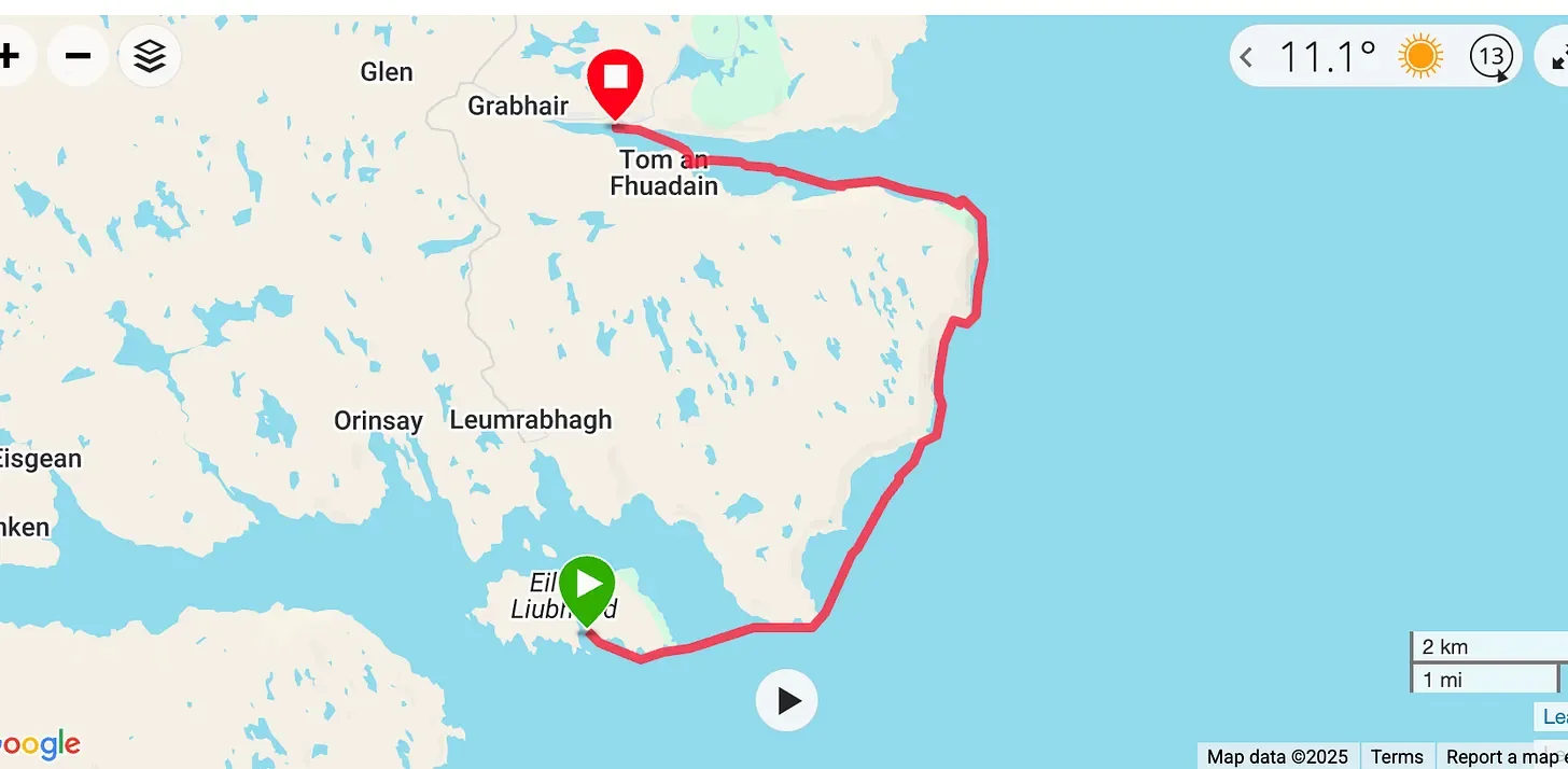 So the conditions became quite difficult and, combining that with the successive jagged headlands that we needed to go round, getting all the way to Stornoway made less and less sense. We turned inland towards Grabhair, where there is a bay and a road. We met a dedicated amateur lobster fisherman there - he had caught more over the previous year than most of us eat. Meeting him marked our return to ‘civilisation’.
